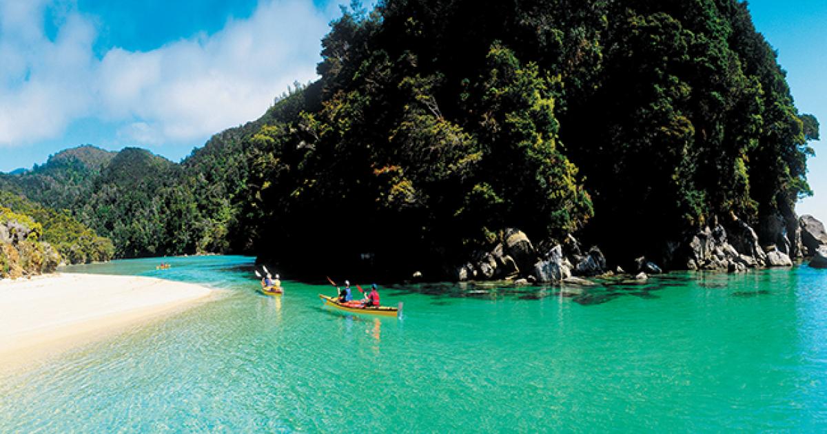 Located on the northern tip of the South Island, Abel Tasman National Park is famous for its golden beaches, crystal-clear waters, and hiking trails.