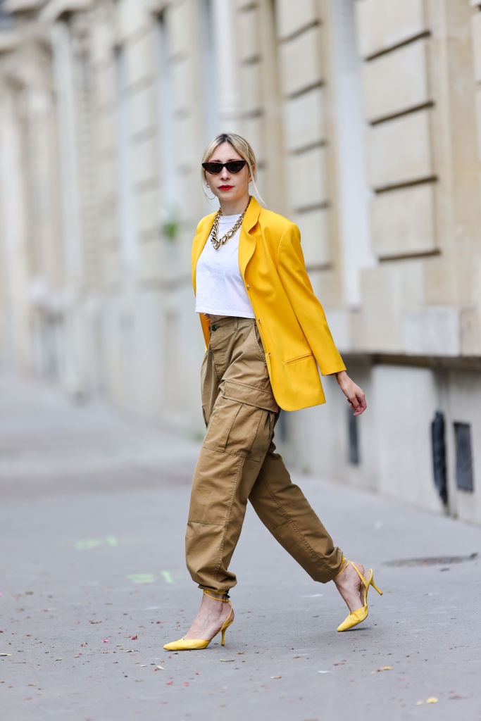 Cargo pants don't have to be limited to casual outfits. You can easily dress them up by pairing them with a blazer. The contrasting styles of the cargo pants and blazer create an interesting and fashionable combination. Choose a fitted blazer in a solid color, such as black or navy, to add a touch of sophistication to your ensemble. Complete the look with a simple blouse or a classic white t-shirt. This combination works well for both daytime and evening events, giving you a chic and stylish appearance.