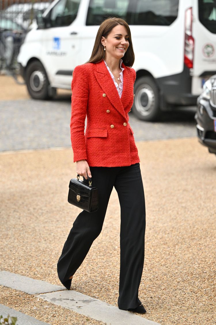 For her visit to the Copenhagen Infant Mental Health Project at the University of Copenhagen, she opted for a blazer from Zara, frill collar top from me+em, midi Mayfair bag from Aspina of London, Gianvito Rossi suede pumps, ‘Cha Cha’ earrings from Maria Black and Monica Vinader vintage chain pearl necklace.