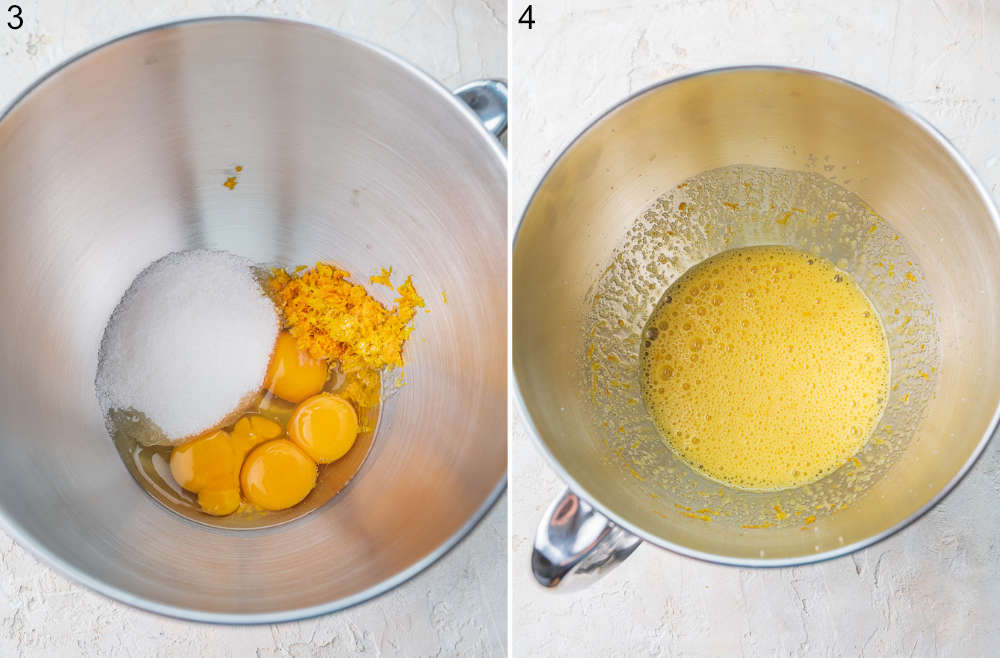 STEP 3: Add the eggs, egg yolks, lemon and orange zest, and the remaining sugar (1/2 cup=100g) into a large bowl.