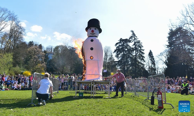 A "snowman" is burnt after the Summer Day Parade in Weinheim, Germany,