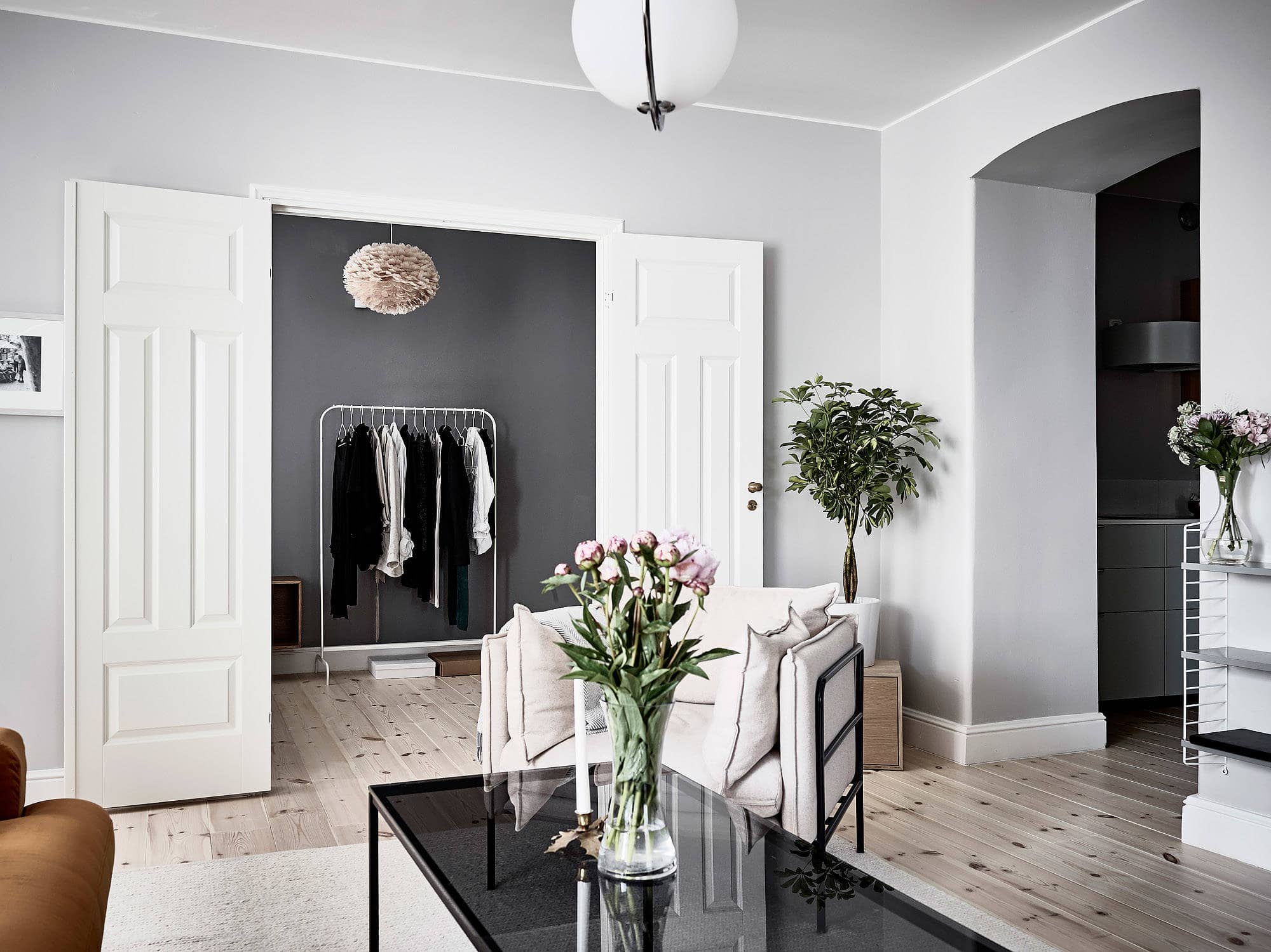 I usually like to use very neutral colors in our home, not just because I like this look, but also because everything always matches together. I’m very much inspired though by this home that has some bold color choices in it. The mustard yellow sofa is a real statement piece and matches the green wing doors and the dark grey bedroom wall very well.