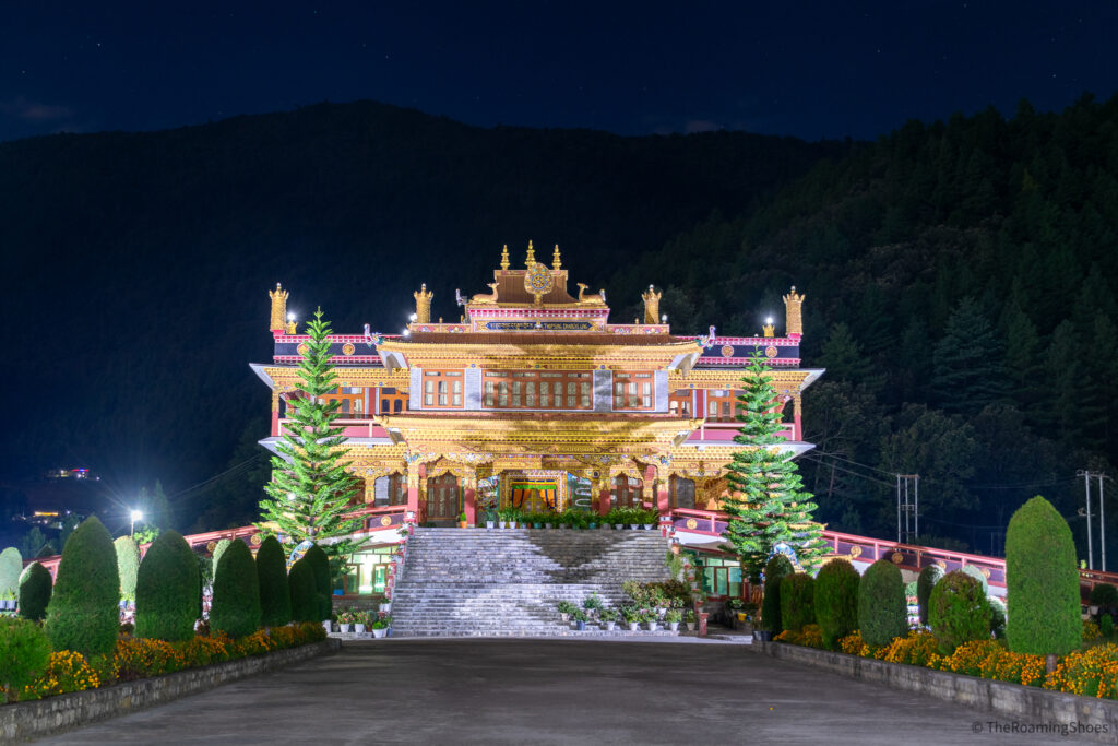 It was around 10 pm when we both opened our eyes to the dimly lit surrounding. The world around us, cloaked in serene stillness, was occasionally interrupted by the distant barking of a dog. Above, stars twinkled in a satin black canvas with white clouds floating by. In front us, the courtyard flanked by neatly manicured trees led to the entrance of the imposing monastery. And behind it, the silhouette of majestic mountains loomed, their regal forms outlined against the night sky. Here, within the walls of Dirang Monastery, nature, architecture, and spirituality coalesced into an extraordinary tapestry.