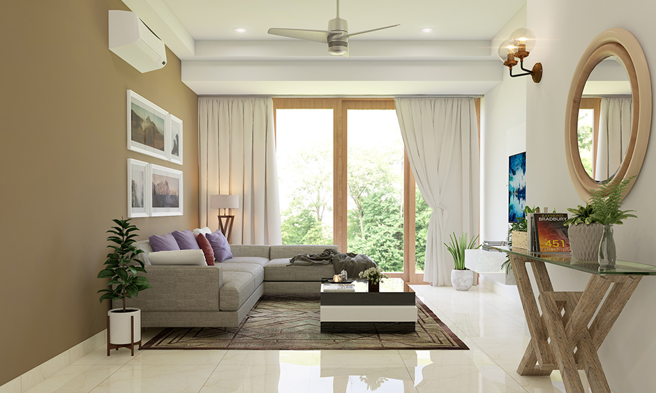 If you find yourself faced with a bare wall or an unoccupied corner near the entrance or foyer that seamlessly connects to your living room, consider adorning it with a captivating mirror. Not only does a statement mirror serve as an exquisite decorative element, but it also offers practicality by providing a convenient spot for a final glance before one departs or enters the abode.