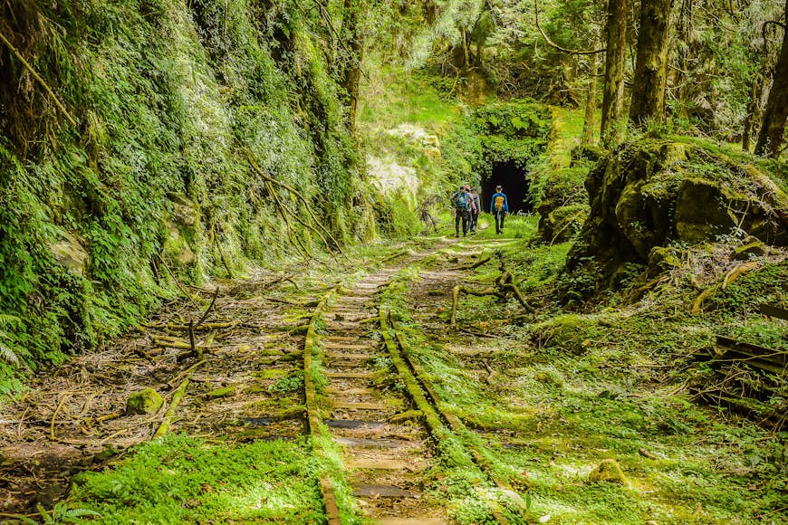 This unusual route follows part of a defunct old logging railway, built by the Japanese a century or so ago to carry timber out of the mountains. Following the tracks for much of the way, hikers have to step carefully from plank to plank over moss-shrouded railway bridges and pick their way through tunnels, some pitch dark and others partially collapsed by earthquakes, all the while marveling at the serene old-growth forest all around.