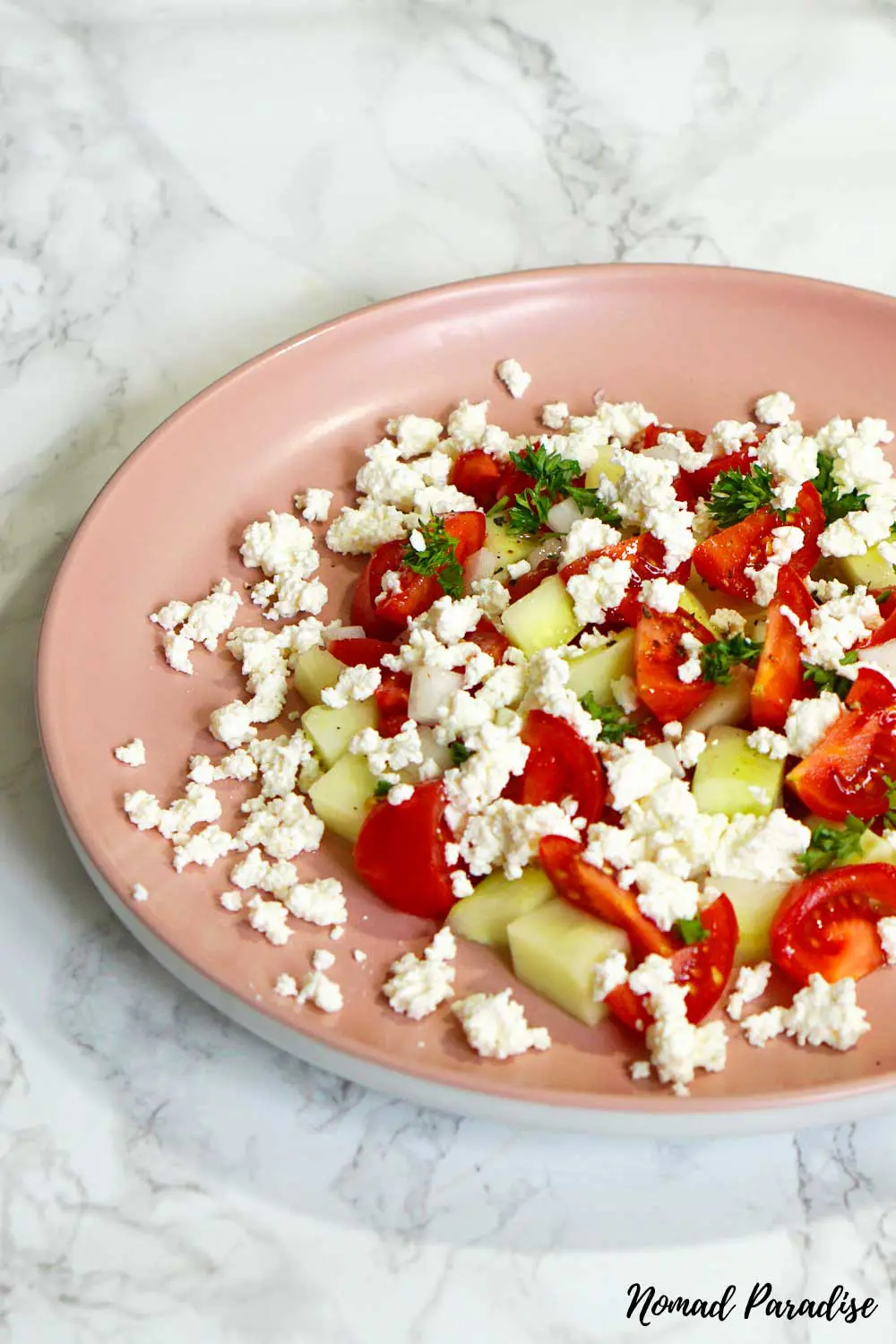 This salad is so easy to make but so delicious. You take some fresh-cut vegetables, mix them, and add the famous Bulgarian white cheese on top: the secret ingredient.
