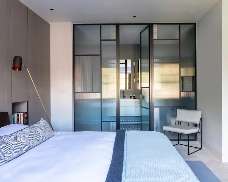 Interior designer recommends using a floor-to-ceiling wall of ribbed glass as a room divider between bedroom and ensuite to let the light flow through the spaces. ‘It makes a design feature with its alternate panels of horizontal and vertical ribbed glass and black framing, and offers some privacy in the bathroom,’ she explains.