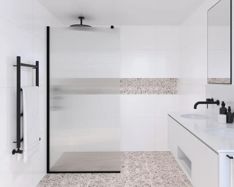 ‘While a clear glass shower screen is always an elegant choice, choosing a frosted, tinted or fluted glass screen will elevate the space to the next level and also give you an unobtrusive yet stylish way to create some privacy.