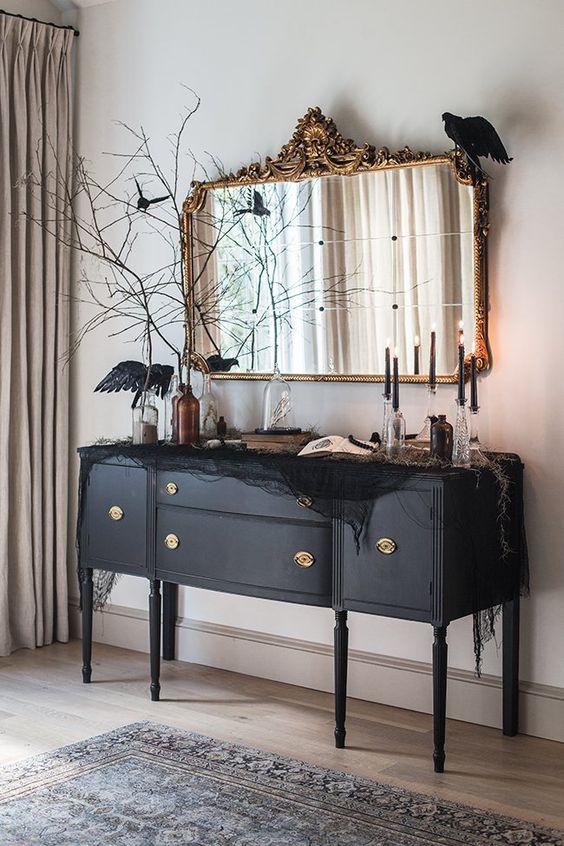 a beautiful black credenza decorated with black spider web, blackbirds, black candles and black branches is amazing. Read More...