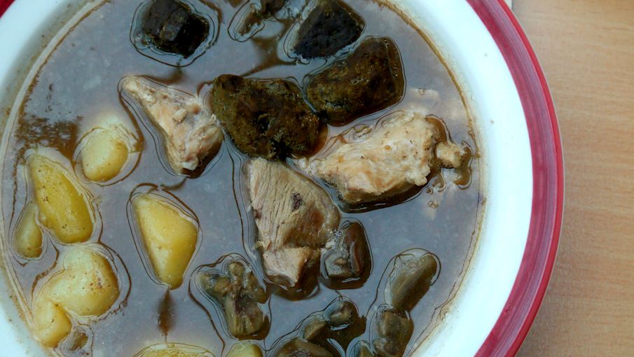 Mykyrokka is a traditional Finnish soup hailing from the central Savo region. It consists of blood dumplings – traditionally prepared with blood and rye flour and usually shaped as flat, palm-sized discs – potatoes, and various types of meat and offal.