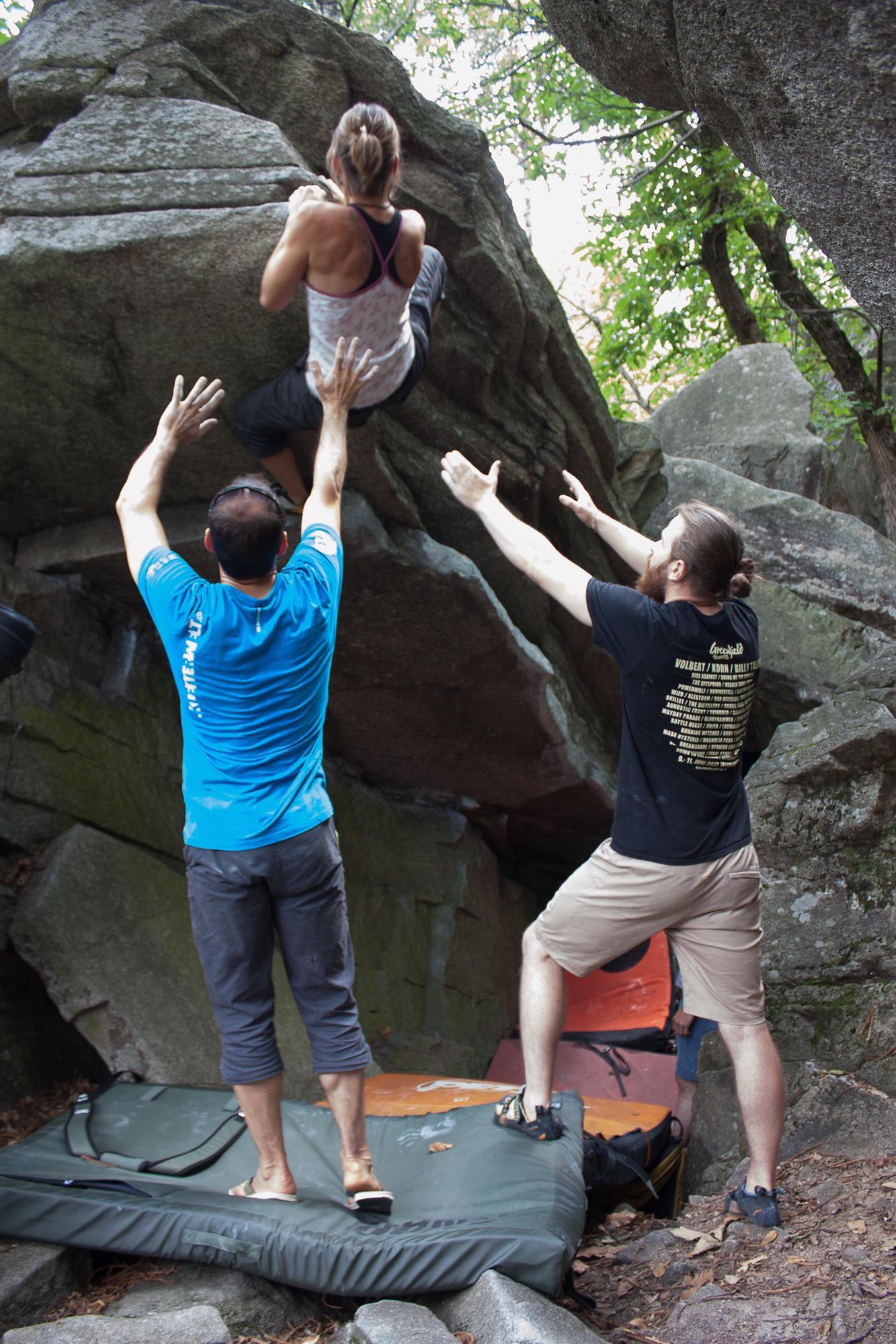The boulder on which three entry routes are described is two to four meters high. Clemens shows how we lay out the bouldering mats on the floor, how we cushion the crash pads, falls or voluntary jumps. He explains how the so-called spotters line up so that they can catch the climbers in the event of a fall and steer them onto the crash pads.