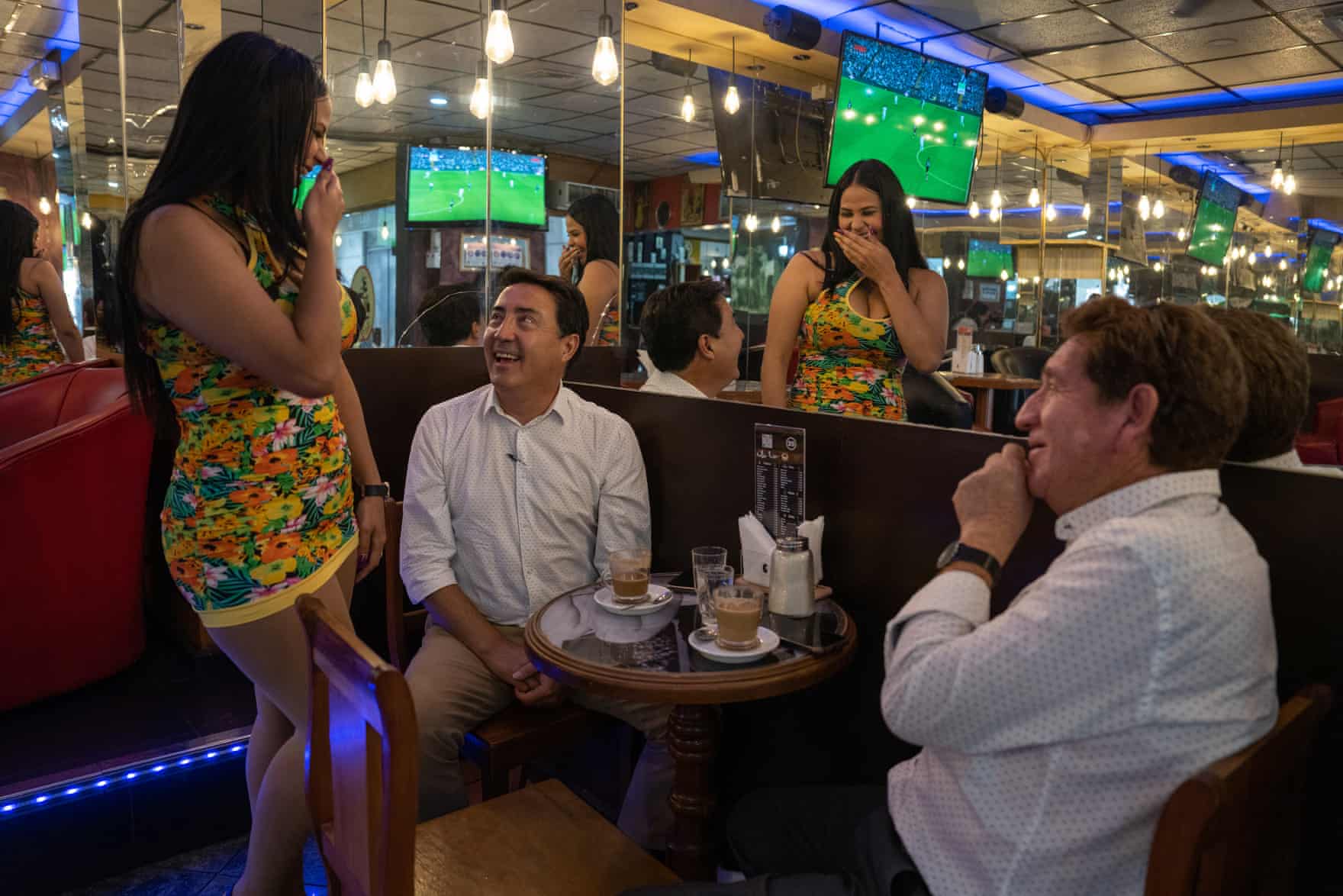 Marco Peña, the 53-year-old owner of Kako's Express, a coffee shop discreetly located in the city center, states that his establishment is not a typical café con piernas like the underground ones he used to run. While the pandemic caused changes in customer patterns, with office vacancies and businessmen reducing their visits to the city center, construction workers, market traders, and even former professional footballers now frequent his café. The waitresses still wear short, floral-print dresses and heels.