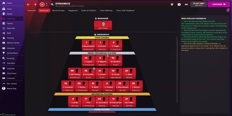 The Dynamics tab gives detailed information on the morale, hierarchy, and social groups of first-team players. This may initially seem like something that the manager can overlook. However, it can be the thing that makes and breaks their career at the club. An unhappy set of players will start to show their displeasure on the pitch, which can lead a manager straight to the sack.