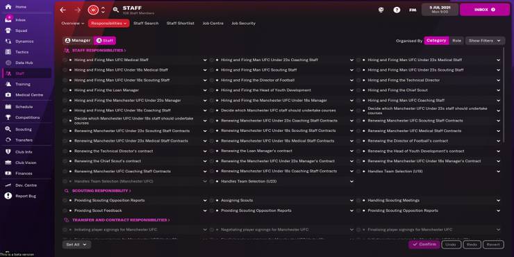 One of the first things that new managers should do is assign roles for their staff. Football Manager 22 lets the manager delegate a wide range of tasks to their staff, which can be invaluable for beginners, as they can come to terms with the game's core mechanics before branching off into more complex features.