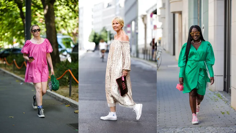Bright Converse trainers are a lovely way to add vibrancy and personality to an otherwise simple or monochrome outfit - hello dopamine dressing - or to create a playful color clash when wearing block-color dresses. If you’d prefer something more understated, black or white high tops will go with pretty much any dress in your closet. A midi or maxi length will reveal just a flash of your shoes, while a mini will really show them off.