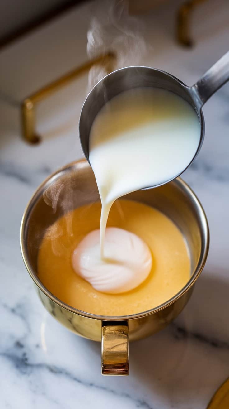 Slowly pour a ladle of the warm milk mixture into the egg mixture, whisking constantly to prevent curdling. Then pour everything back into the saucepan.