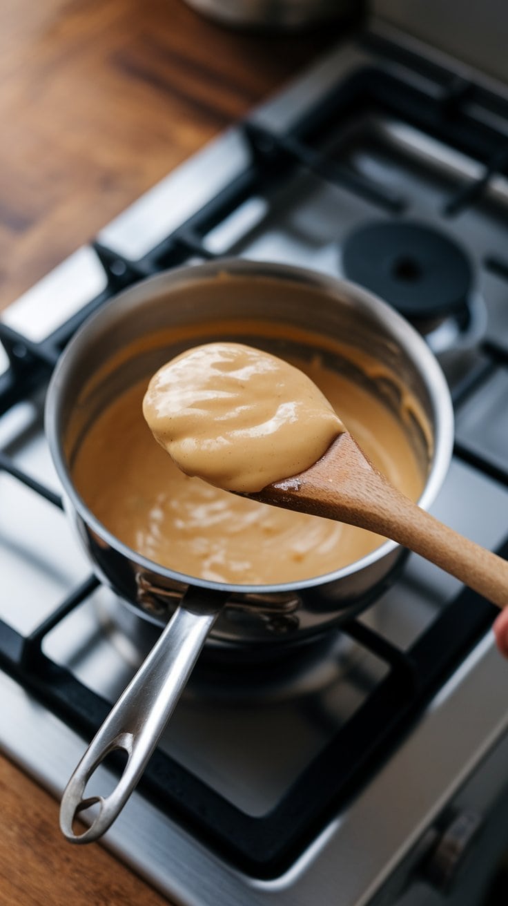 Cook the mixture over low heat, stirring constantly with a wooden spoon, until it thickens enough to coat the back of the spoon. Do not let it boil.