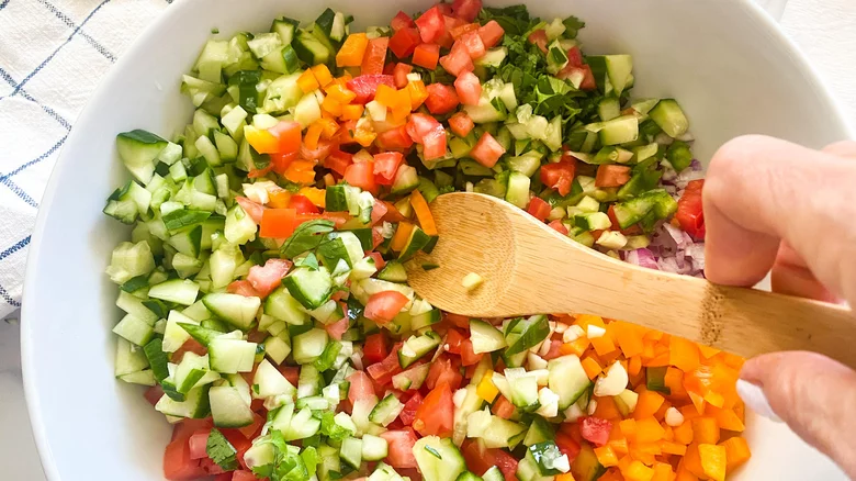 Now that you have all of your ingredients purchased and in front of you, it's time to get this cooking party started. Take out a large bowl and get ready to toss in a few ingredients. The first thing you can throw in is the Roma tomatoes — these should be diced and seeded ahead of time. At this time, you can also toss in the diced onion, cucumber, bell pepper, and jalapeño. "For cutting the veggies, I typically use an onion chopper for onion. The other ones, I do a rough chop, then take my big chef's knife and run it over, up and down over a big clump of the veggies," Hahn says.