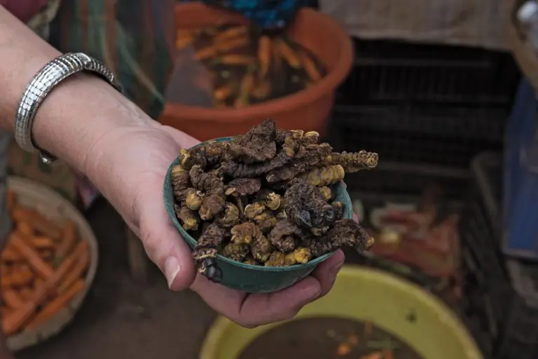 Once softened, the worms are traditionally pan-fried with tomatoes, onions, and chilies, until they are crispy.