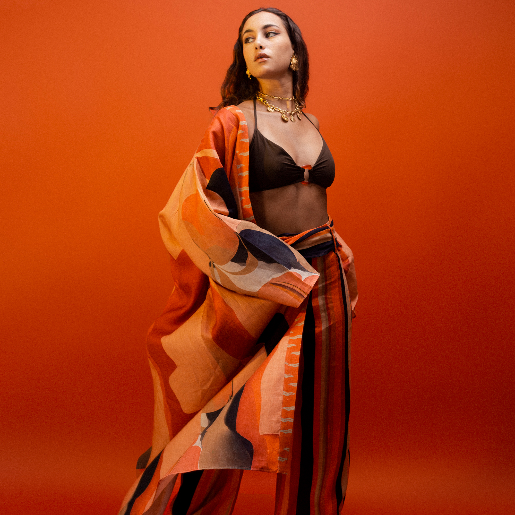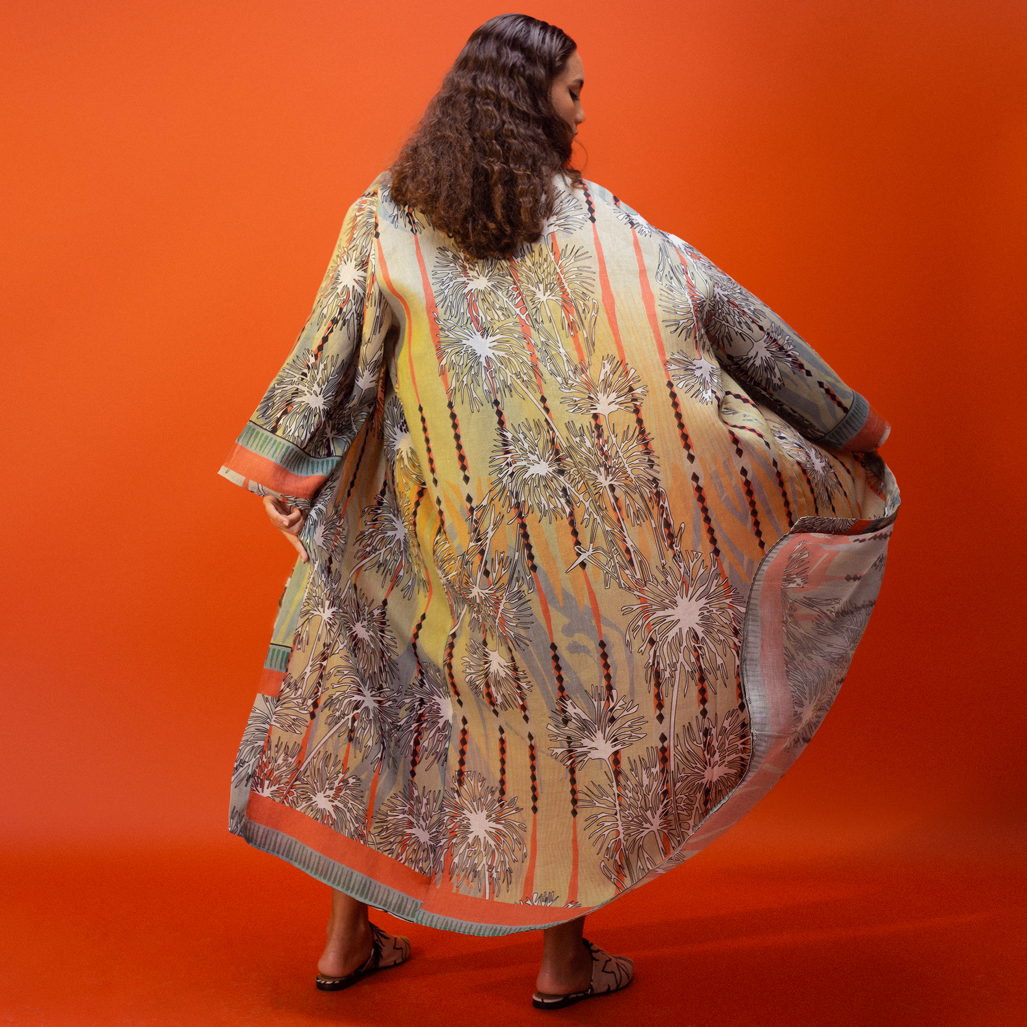 Echoing the brand’s focus on storytelling, each piece within the collection stands autonomously as a story in and of its own. “Shagaret El Durr is extremely whimsical in nature, it’s funny, and the protagonists, in all their eccentricity, inspired many of the pieces,” Hassanein continues. “Our peacock linen kimono is inspired by a scene where you see a peacock standing atop a table, which is a metaphorical representation of Shagaret El Durr’s own vigour and prowess.”