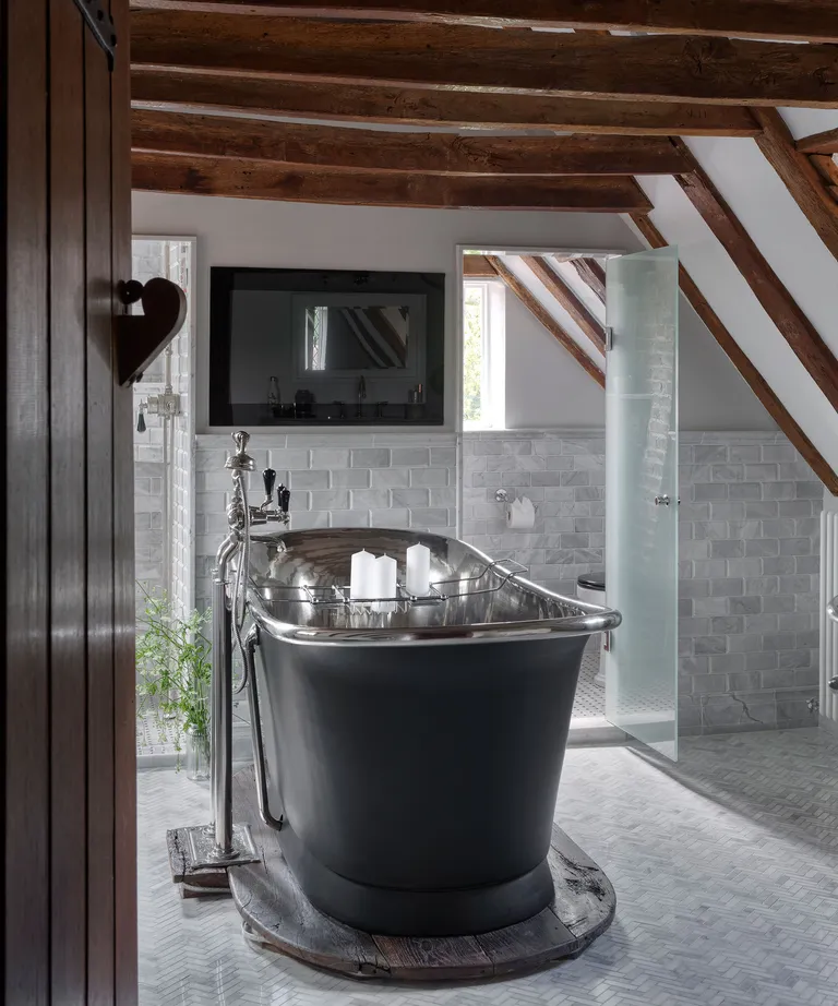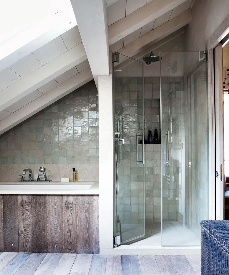 Not all rustic bathrooms need to look particularly countryfied. Modern interpretations are just as beautiful. This serene space was designed by Alexis Soof with tiles from Clé.