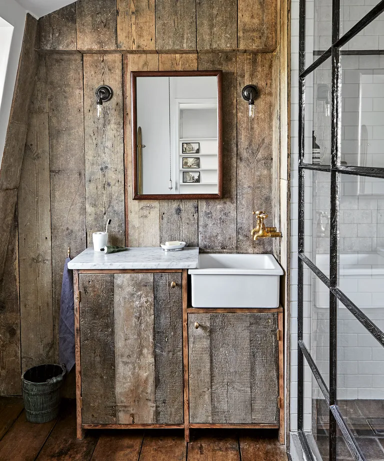 Naturally aged and distressed, reclaimed floorboards bring rustic charm to walls and can prove surprisingly resilient in the bathroom. The floorboards used here came from a local salvage yard.