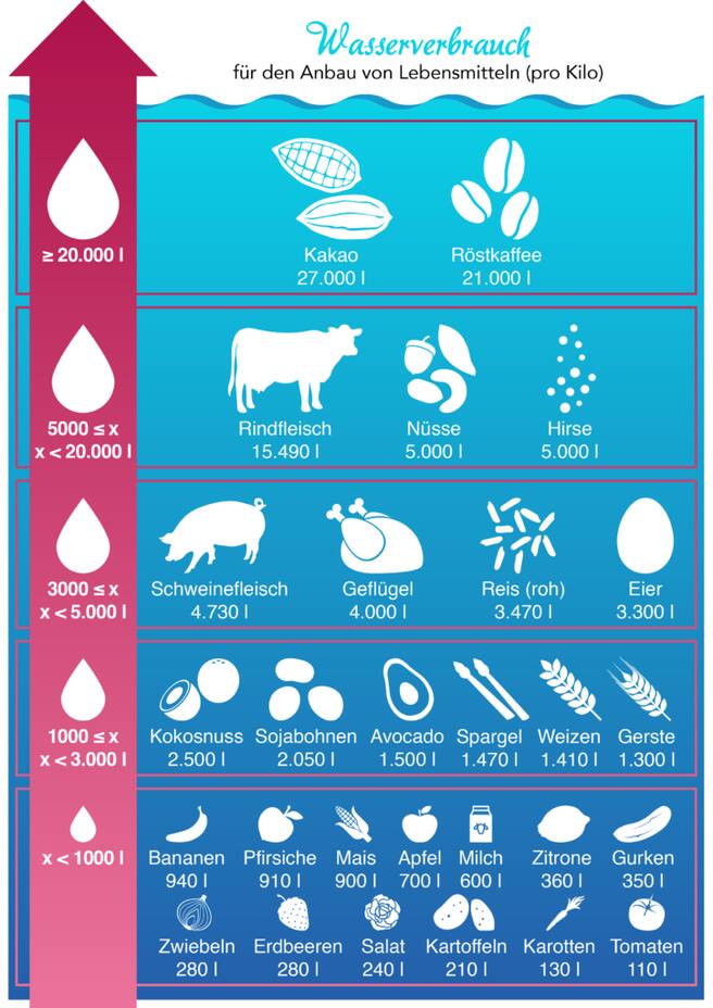 Cocoa and coffee in particular consume a lot of water: Cocoa has the highest water consumption at 27,000 liters per kilo, followed by coffee at 21,000 liters and beef at 15,490 liters.
