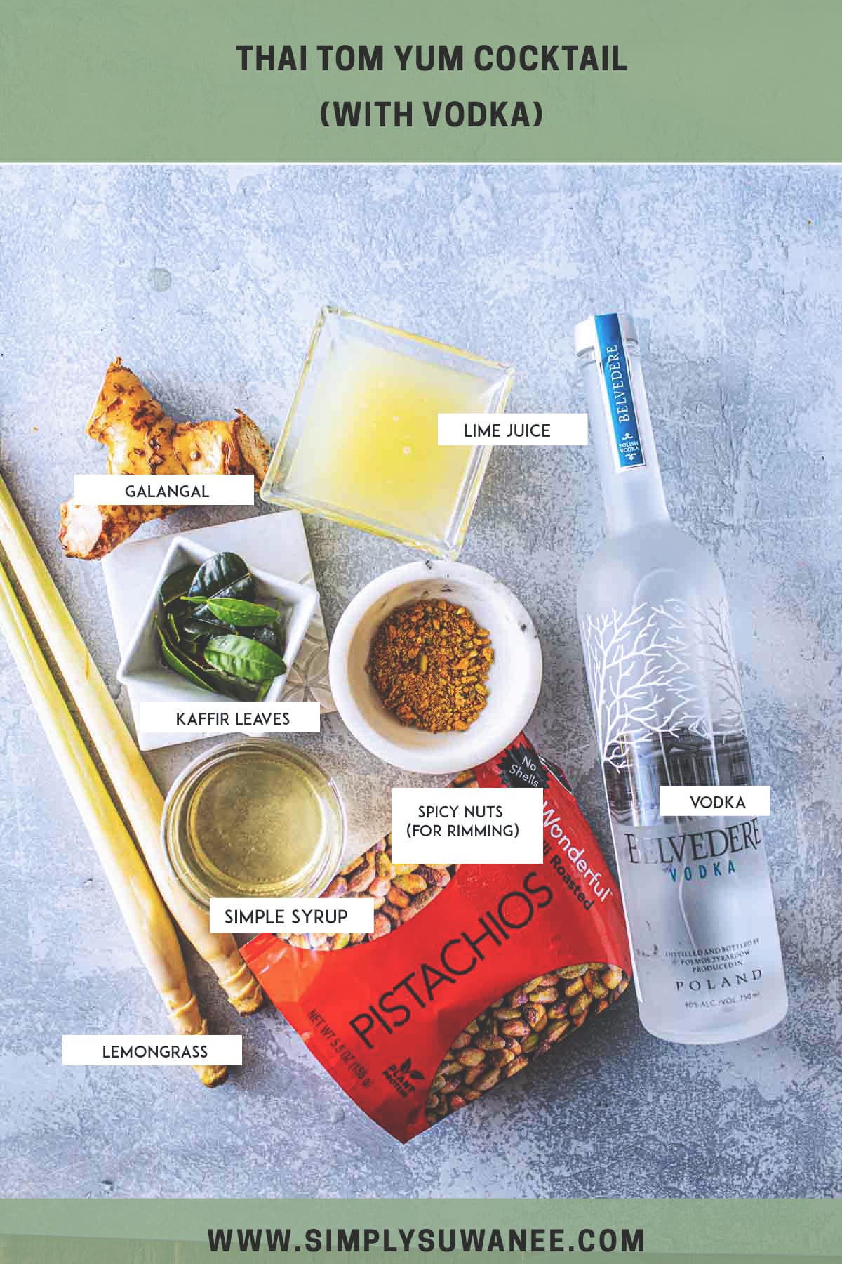 There are the ingredients you'll need for this lip-smacking cocktail recipe. A few of the Thai ingredients, like lemongrass, kaffir lime leaves, and galangal, can be found at your local Asian markets in the refrigerated or frozen section.